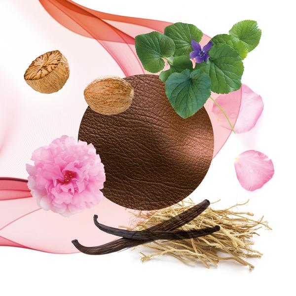 La fragrance s'ouvre sur un cocktail d'épices qui affiche une forte personnalité contrastant avec les feuilles de violette, suaves et élégantes. Le cœur doux aux accents de rose, se fait rond grâce aux notes cuirées et à la volupté de l'opoponax. Le sillage s'appuie sur la masculinité du vétiver et la suavité de la vanille.