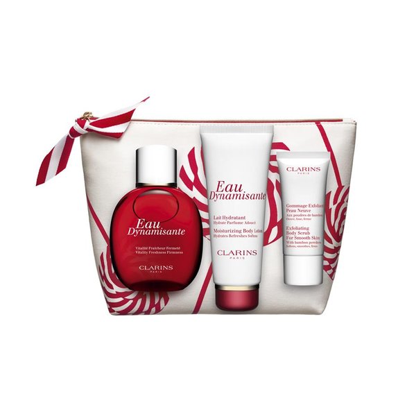 Le cadeau qui change du classique parfum ? L'Eau de Soins, pour sentir bon et se sentir bien ! Le coffret associe un soin et un parfum autour de l'Eau dynamisante, classique Clarins qui revitalise et tonifie le corps tout en laissant la peau délicatement parfumée. L'eau de toilette Eau Dynamisante se décline en lait corporel, un soin du corps qui redonne tonus et éclat à la peau. Le Gommage Exfoliant complète ce coffret soin du corps pour un effet peau neuve.