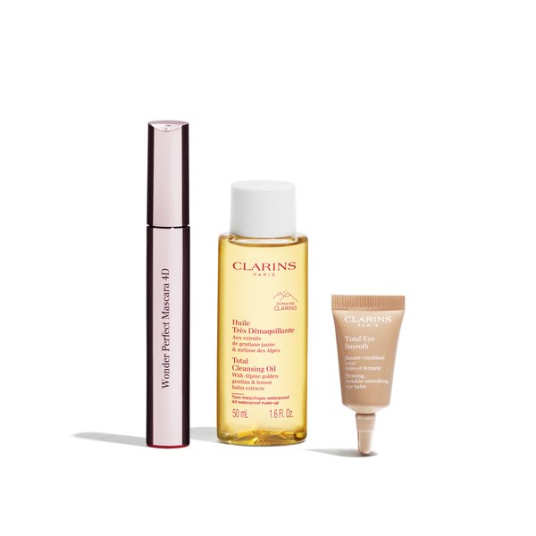 Mascara Wonder Perfect 4D: INGREDIENTS : AQUA/WATER/EAU. CI 77499/IRON OXIDES. SYNTHETIC BEESWAX. ACRYLATES/ETHYLHEXYL ACRYLATE COPOLYMER. PARAFFIN. GLYCERYL STEARATE. STEARIC ACID. COPERNICIA CERIFERA CERA/COPERNICIA CERIFERA (CARNAUBA) WAX/CIRE DE CARNAUBA. ORYZA SATIVA (RICE) BRAN WAX. PVP. AMINOMETHYL PROPANEDIOL. BUTYLENE GLYCOL. SORBITAN SESQUIOLEATE. PHENOXYETHANOL. CERA MICROCRISTALLINA/MICROCRYSTALLINE WAX/CIRE MICROCRISTALLINE. HYDROXYETHYLCELLULOSE. PANTHENOL. ROSA CENTIFOLIA FLOWER WAX. ROSA DAMASCENA FLOWER WAX. SUCROSE STEARATE. SPHINGANINE. DIMETHICONE. CAPRYLYL GLYCOL. ASCORBYL PALMITATE. TOCOPHEROL. LAURETH-21. POTASSIUM SORBATE. SYNTHETIC WAX. SODIUM STEARATE. HEXYLENE GLYCOL. [MS3211A/00] Total Eye Smooth: INGREDIENTS : AQUA/WATER/EAU. DIMETHICONE. GLYCERIN. ISONONYL ISONONANOATE. BETAINE. CETEARYL ALCOHOL. DICAPRYLYL CARBONATE. CI 77891/TITANIUM DIOXIDE. CELLULOSE. GLYCERYL STEARATE. PEG-100 STEARATE. PRUNUS AMYGDALUS DULCIS (SWEET ALMOND) OIL. STEAROXYMETHICONE/DIMETHICONE COPOLYMER. SYNTHETIC FLUORPHLOGOPITE. ALBIZIA JULIBRISSIN BARK EXTRACT. CAFFEINE. CETEARYL GLUCOSIDE. SODIUM POLYACRYLATE. ANIGOZANTHOS FLAVIDUS EXTRACT. CAPRYLYL GLYCOL. ETHYLHEXYLGLYCERIN. PARFUM/FRAGRANCE. TOCOPHERYL ACETATE. ACRYLATES/C10-30 ALKYL ACRYLATE CROSSPOLYMER. AVENA SATIVA (OAT) KERNEL EXTRACT. DISODIUM EDTA. ESCIN. DIMETHICONOL. BUTYLENE GLYCOL. SORBITOL. TOCOPHEROL. MARRUBIUM VULGARE EXTRACT. SODIUM HYDROXIDE. TIN OXIDE. SODIUM BENZOATE. MITRACARPUS SCABER EXTRACT. CAPSICUM ANNUUM FRUIT EXTRACT. PHENETHYL ALCOHOL. FURCELLARIA LUMBRICALIS EXTRACT. HELIANTHUS ANNUUS (SUNFLOWER) SEED OIL. LAPSANA COMMUNIS FLOWER/LEAF/STEM EXTRACT. MARIS SAL/SEA SALT/SEL MARIN. ROSMARINUS OFFICINALIS (ROSEMARY) LEAF EXTRACT. [V3932A] Huile Tres Demaquillante: INGREDIENTS : HELIANTHUS ANNUUS (SUNFLOWER) SEED OIL. C9-12 ALKANE. PEG-20 GLYCERYL TRIISOSTEARATE. PRUNUS ARMENIACA (APRICOT) KERNEL OIL. AQUA/WATER/EAU. PROPANEDIOL. PARFUM/FRAGRANCE. TOCOPHEROL. MELISSA OFFICINALIS LEAF EXTRACT*. SODIUM CITRATE. GENTIANA LUTEA EXTRACT*. CITRIC ACID. CAPSICUM ANNUUM FRUIT EXTRACT. MALTODEXTRIN. MORINGA OLEIFERA SEED EXTRACT. ROSMARINUS OFFICINALIS (ROSEMARY) LEAF EXTRACT. [V3545A] Please be aware that ingredient lists may change or vary from time to time. Please refer to the ingredient list on the product.