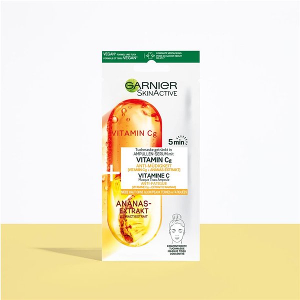 Ce masque tissu anti-fatigue enrichi en vitamine Cg et en extraits d'ananas Garnier SkinActive aide à illuminer et à restaurer votre éclat naturel. Le masque de tissu est imprégné du sérum sous forme d'ampoule : un vrai coup de boost pour votre visage ! Après 5 minutes, la peau est illuminée et semble aussi reposée qu'après une bonne nuit de sommeil. Le masque tissu est à utiliser de préférence après une nuit trop courte, aux changements de saison ou simplement avant un rendez-vous important. Convient aux peaux fatiguées.