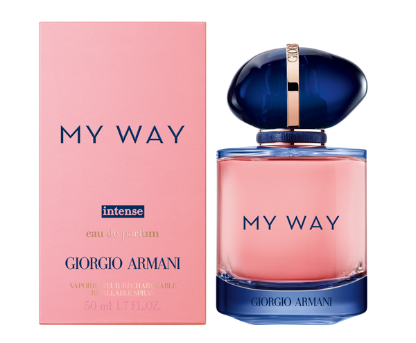 "My Way Intense vous invite à un voyage intérieur, à la rencontre de ces rendez-vous essentiels et de ces expériences extraordinaires qui marquent une vie. Sa floralité intense se prolonge par un sillage boisé addictif, dans une formule unique dont chaque ingrédient relève d’un choix responsable. Le parfum s’ouvre sur l’éclat lumineux de la fleur d’oranger d’Égypte. Le nouveau cœur intense de tubéreuse originaire d’Inde apporte son onctuosité et son velouté à la signature florale. Le bois de santal de Nouvelle-Calédonie révèle une note de fond soyeuse et addictive lorsqu’il s’allie à la volupté de la vanille de Madagascar. À la manière d’un talisman, le capuchon-bijou bleu & or concentre les expériences les plus marquantes de la vie et communique sa puissance au flacon My Way Intense pour l’auréoler d’un éclat bleu translucide. En raison de son système de recharge innovant, de ses ingrédients sélectionnés dans le respect d’un approvisionnement responsable et durable ou encore de la préservation de la biodiversité au travers de programmes de conservation des forêts, I AM WHAT I LIVE."