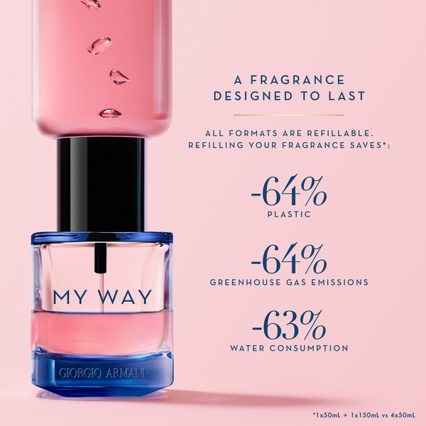 "My Way Intense vous invite à un voyage intérieur, à la rencontre de ces rendez-vous essentiels et de ces expériences extraordinaires qui marquent une vie. Sa floralité intense se prolonge par un sillage boisé addictif, dans une formule unique dont chaque ingrédient relève d’un choix responsable. Le parfum s’ouvre sur l’éclat lumineux de la fleur d’oranger d’Égypte. Le nouveau cœur intense de tubéreuse originaire d’Inde apporte son onctuosité et son velouté à la signature florale. Le bois de santal de Nouvelle-Calédonie révèle une note de fond soyeuse et addictive lorsqu’il s’allie à la volupté de la vanille de Madagascar. À la manière d’un talisman, le capuchon-bijou bleu & or concentre les expériences les plus marquantes de la vie et communique sa puissance au flacon My Way Intense pour l’auréoler d’un éclat bleu translucide. En raison de son système de recharge innovant, de ses ingrédients sélectionnés dans le respect d’un approvisionnement responsable et durable ou encore de la préservation de la biodiversité au travers de programmes de conservation des forêts, I AM WHAT I LIVE."