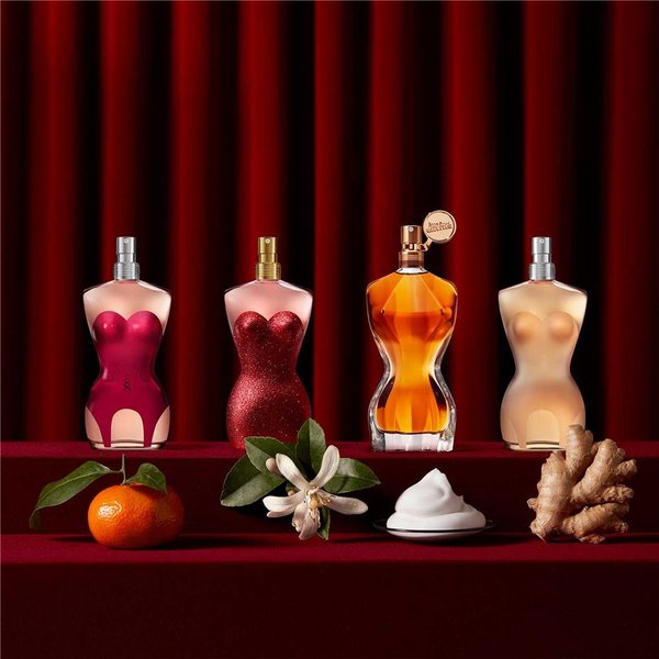 Classique Essence de Parfum de Jean Paul Gaultier, offre une nouvelle version de la féminité avec une silhouette pour la première fois redessinée : moins de seins mais plus de hanches !