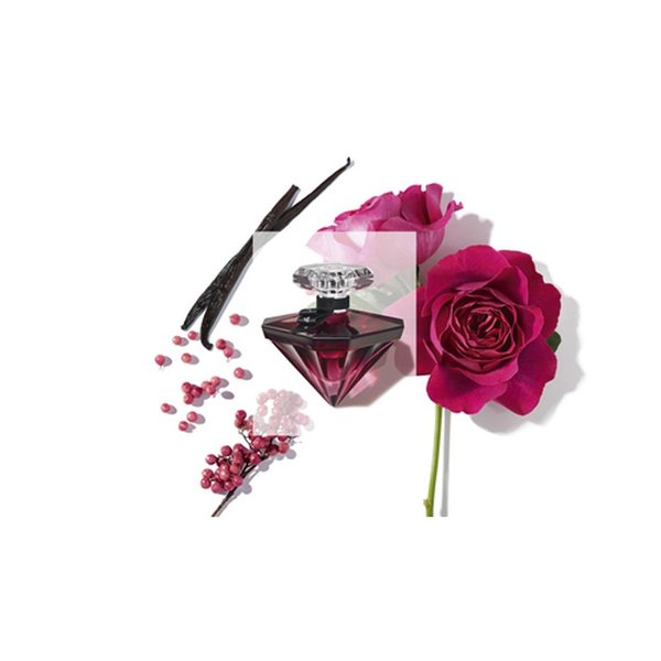 La Nuit Trésor À la folie est un filtre d'amour sensuel et addictif au coeur somptueux de rose ardente, d'ambre et de vanille.