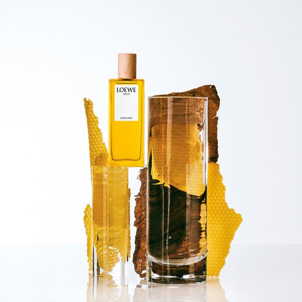 L'eau de parfum LOEWE Solo Mercurio est encapsulée dans un flacon en verre translucide de couleur ambre jaune.