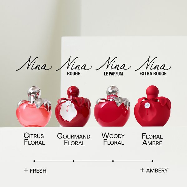 Nina Le Parfum de Nina Ricci n’est pas de ceux que l’on vaporise en passant et que l’on oublie dans la minute qui suit. Dans son sillage hypnotique fleurissent des fleurs blanches élégantes, des pommes juteuses déploient leur parfum entêtant et des bois ambrés diffusent toute leur chaleur. Une telle fragrance, à la fois fruitée, florale et boisée, vous pousse à une vie d’audace et d’intensité, à donner à vos rêves une dimension enivrante, à suivre votre instinct pour voir dans quels délices il peut vous plonger. Une véritable invitation à prendre des risques et à sortir des sentiers battus.