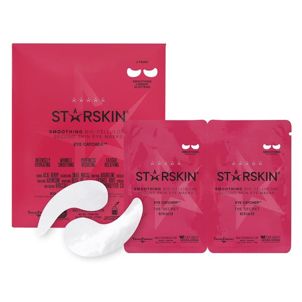 Lumière, caméra, action ! Tous les regards seront tournés vers vous grâce à Eye Catcher™, le masque biocellulose premium de STARSKIN® spécialement créé pour les contours délicats des yeux. Avec une formule composée de jus de noix de coco naturellement fermenté et riche en vitamine, ce masque yeux très hydratant sature la peau de sérum contenant de l'adénosine qui lisse les rides, de l'extrait de racine de réglisse qui apporte de l'éclat et de l'allantoïne apaisante. Le regard a de suite l'air plus éclatant, plus radieux et est revigoré puisque les petites lignes, les poches et les cernes sont réduites en seulement 15 minutes. Incontournable pour les grandes stars lors de fêtes et pendant de longs vols !